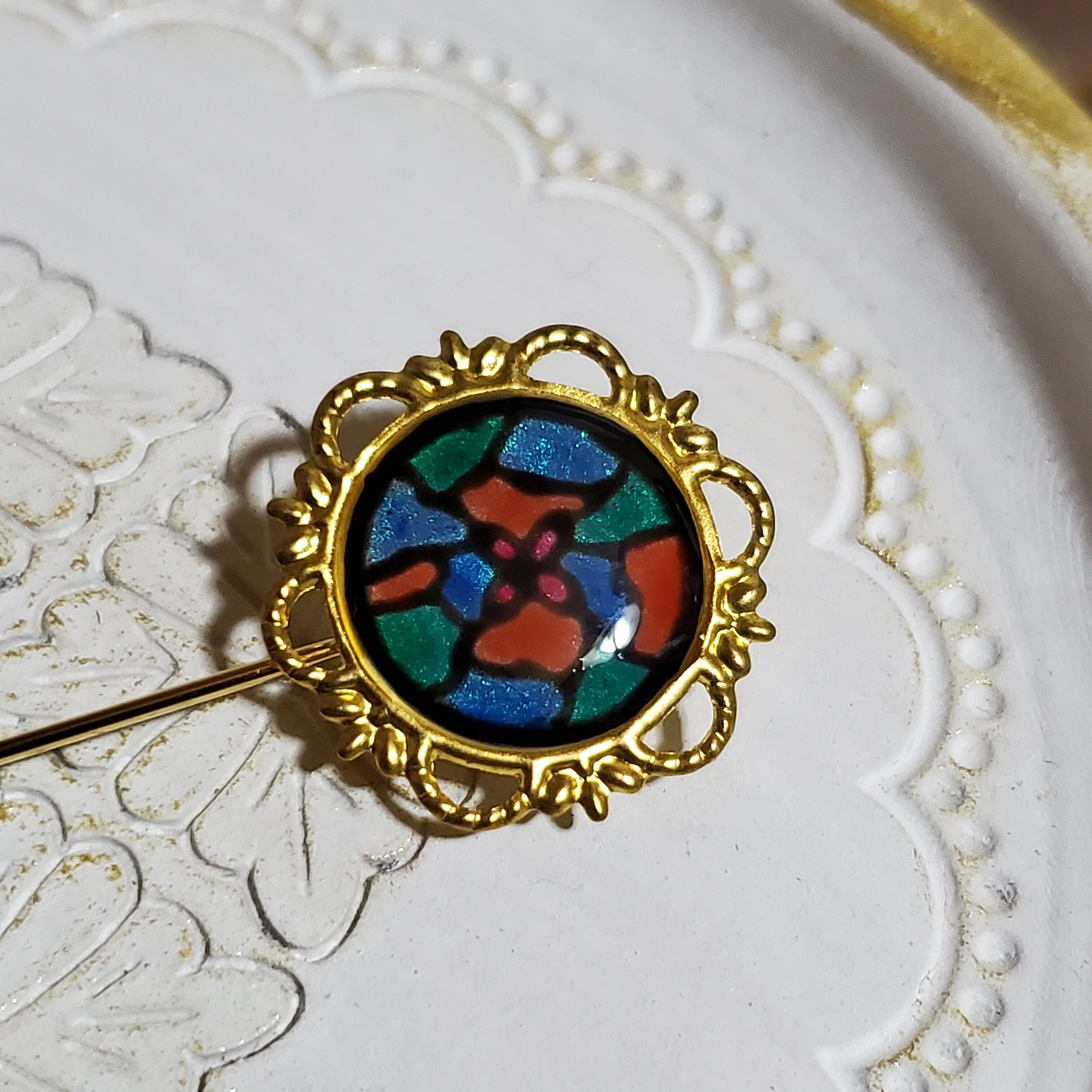 ステンドグラス風のアクセサリーってあまり他の人が着けてるのを見ない気がしますので、自分だけの個性が欲しい時にも。