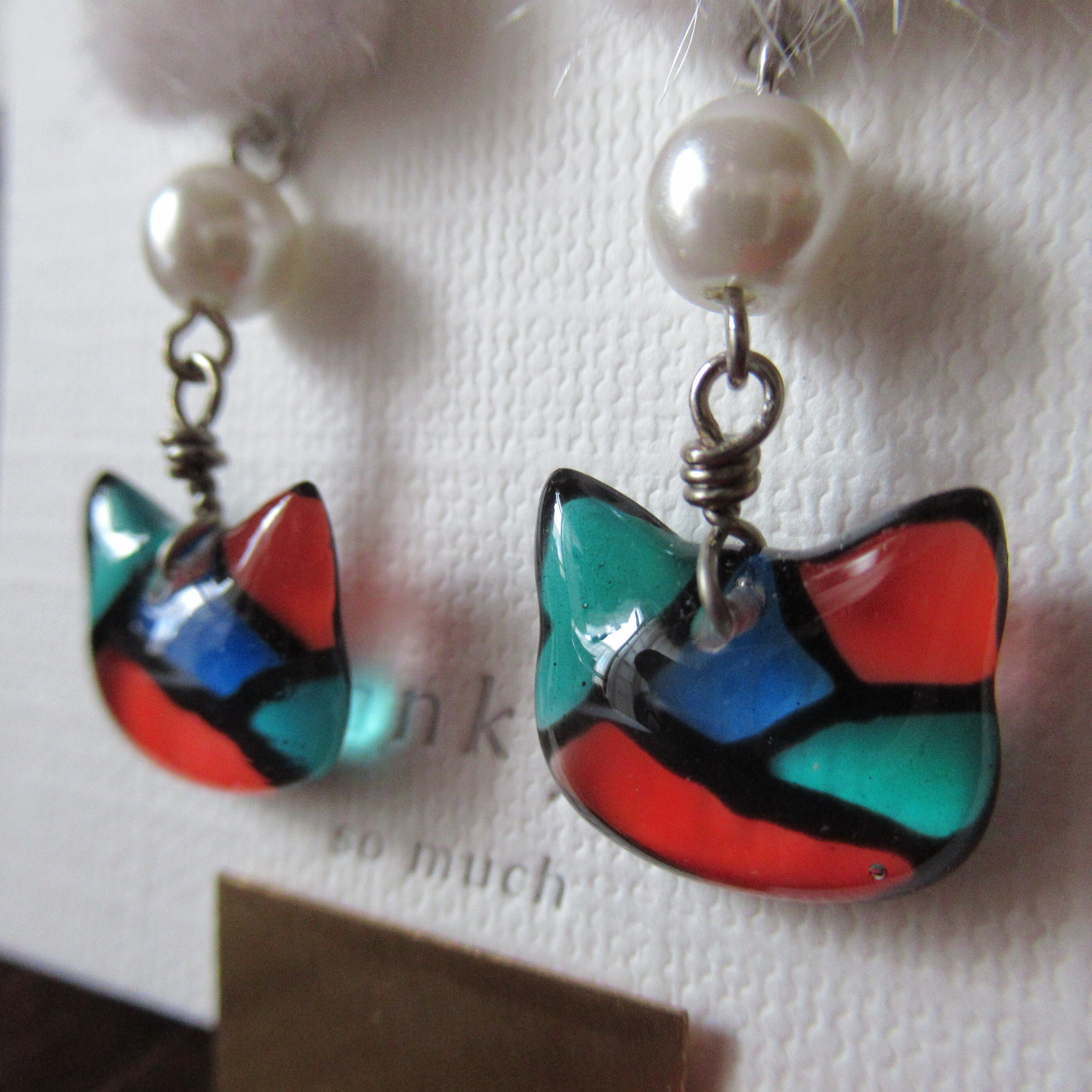 ステンドグラス風ねこさんモチーフ×もふもふのファーのかわいらしいイヤリングです。