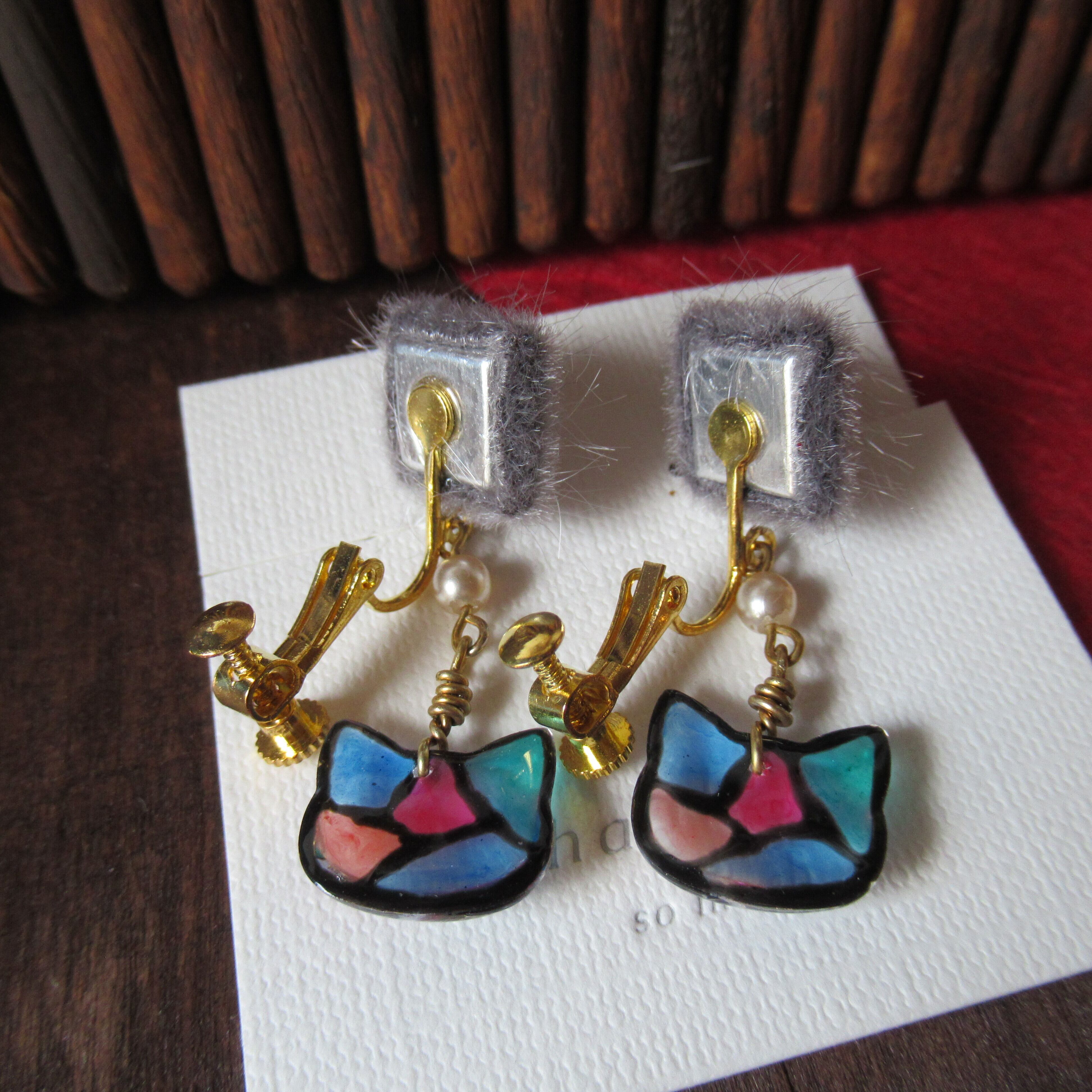 ステンドグラス風ねこさんモチーフ×もふもふのファーのかわいらしいイヤリングです。