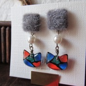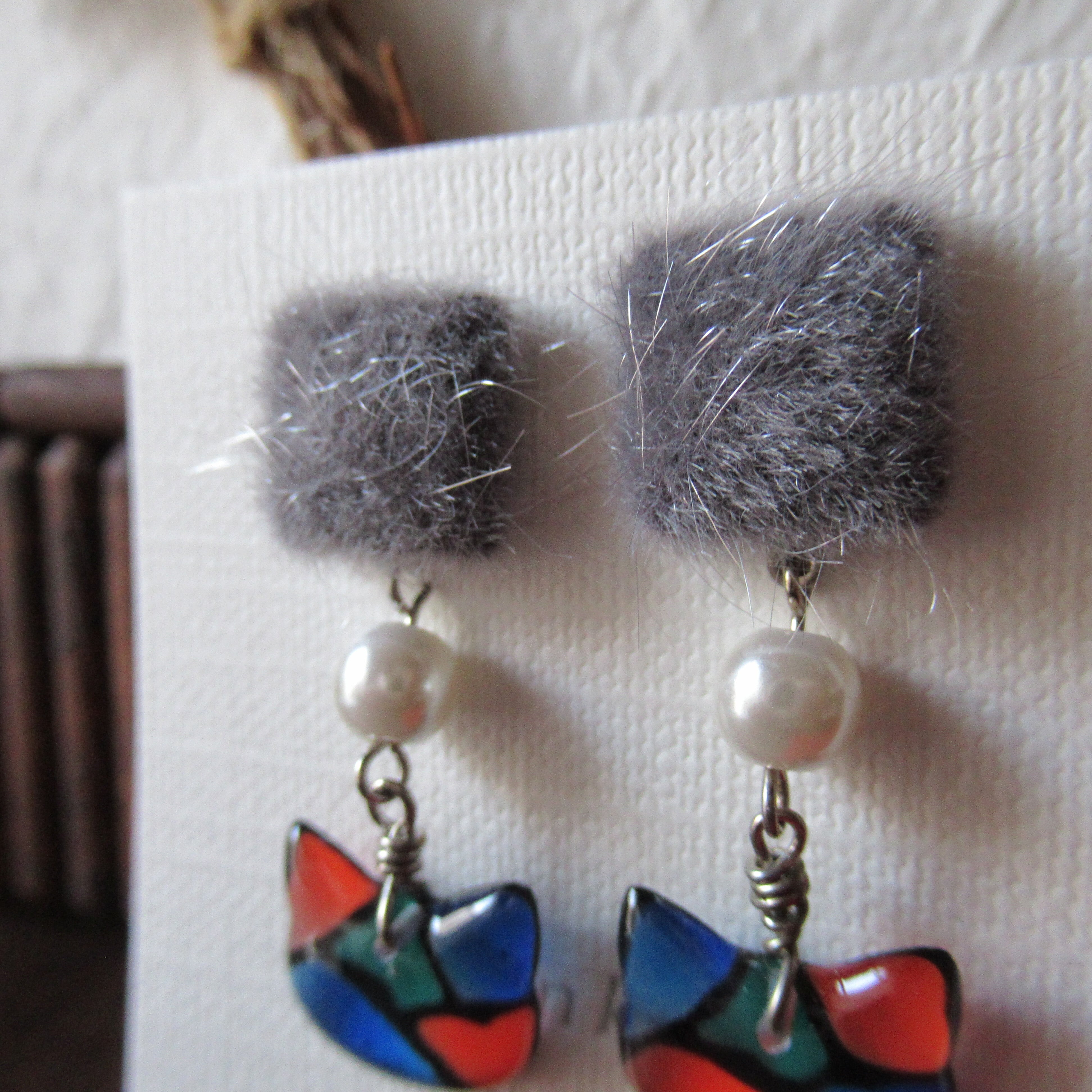 ステンドグラス風ねこさんモチーフ×もふもふのファーのかわいらしいピアスです。